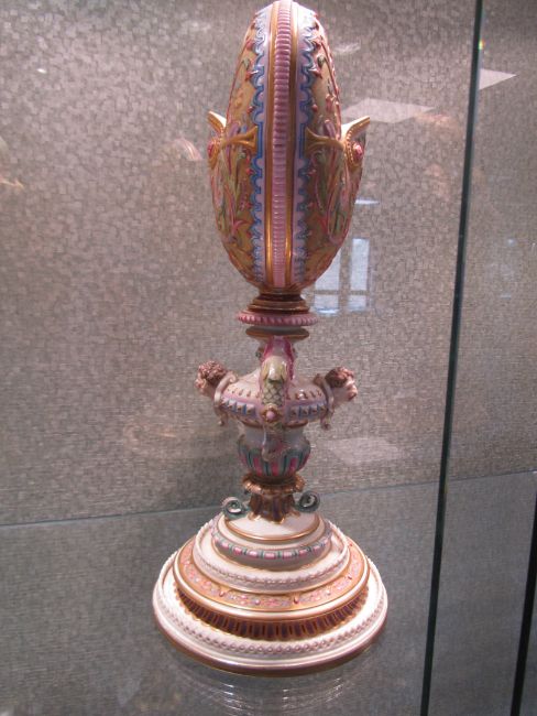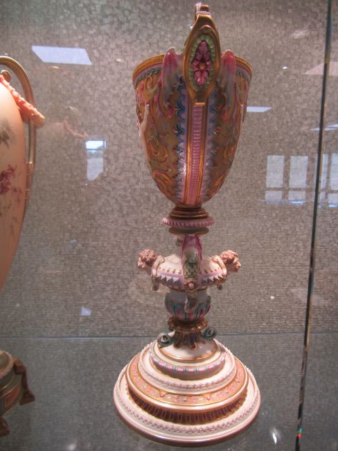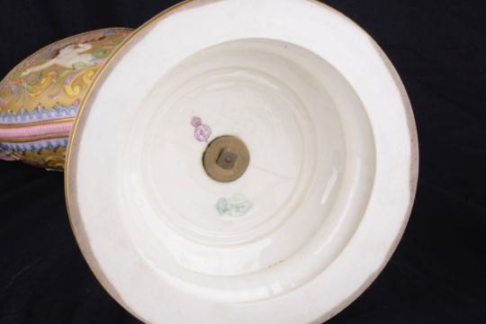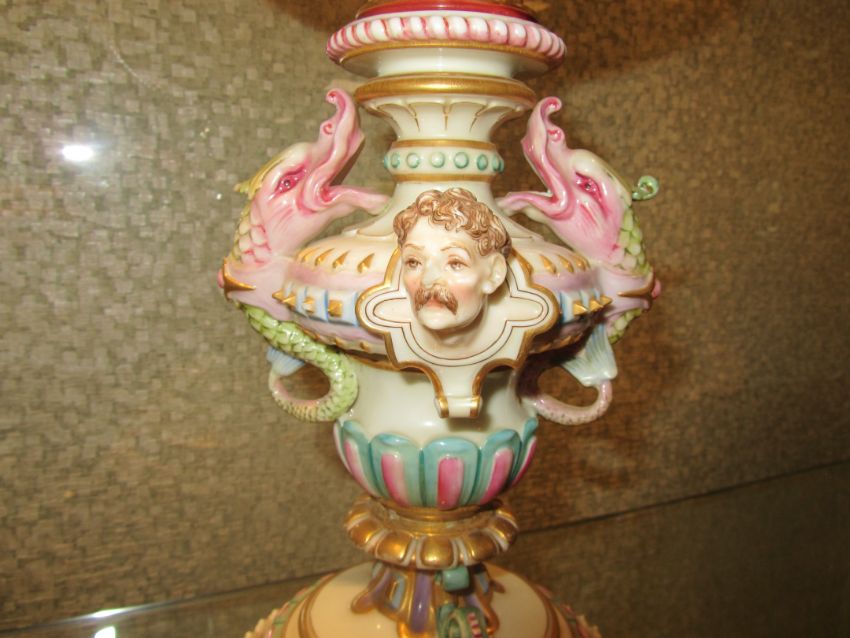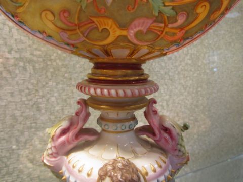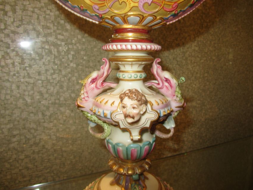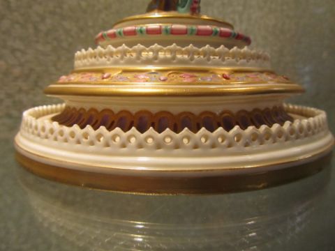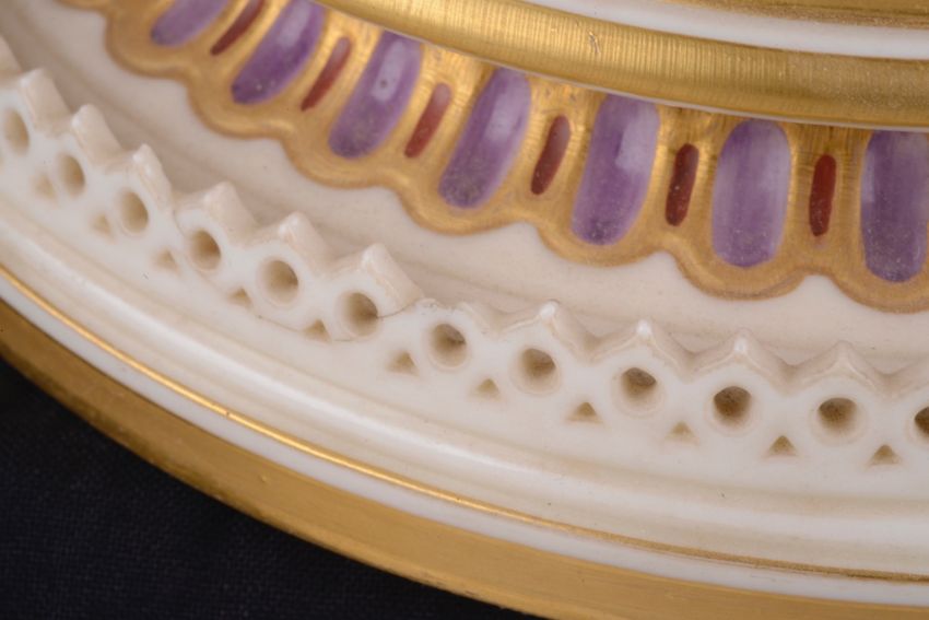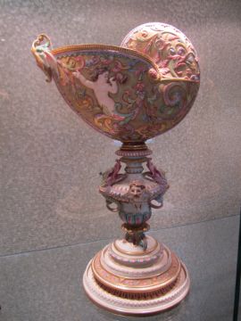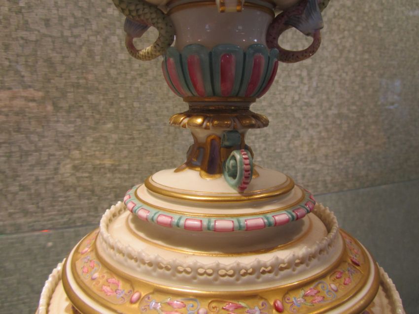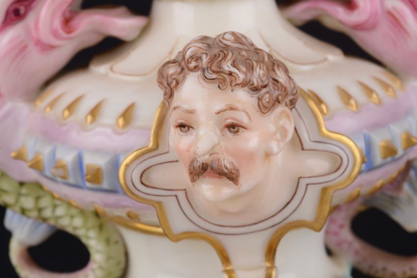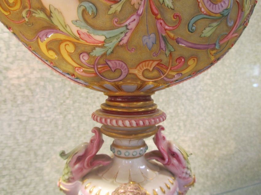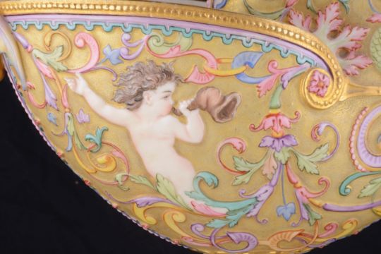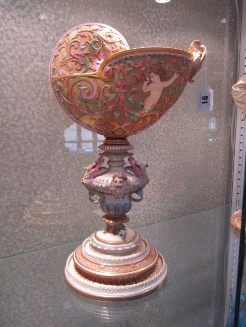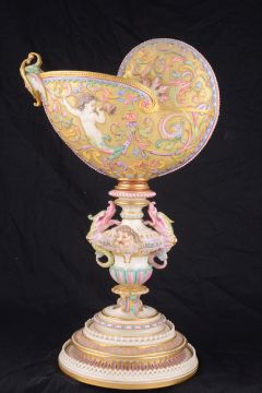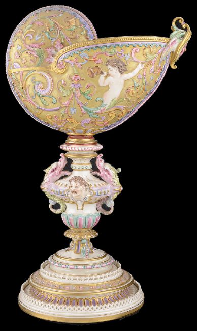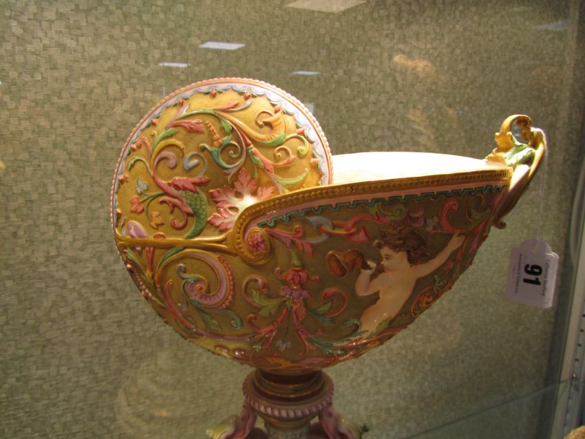 An impressive and rare Royal Worcester Renaissance style centrepiece modelled by Hadley as a nautilus shell, circa 1878 richly decorated with scrolls, leaves, putti with shells, and fish, raised on a shaped pedestal with sea creatures and figural head mounts on a tiered and pierced stepped base, the shell decorated by Callowhill, with green and puce marks to base, shape number 525 height 43cm., diameter of shell at widest point 25cm Condition: Upon closer inspection we have noticed that the shell has been broken from base at iron red banding and visibly glued with fixing to shell interior. Two manufacturer firing cracks to shell interior by whirl en. One dolphin missing scroll on top of head. One mask has chipped nose with chip to one gilded pyramid detail aongside him. Small glued repair to lower pierced gallery section which has a few tiny and indistinct 'nicks' too. One green scrolll beneath mask glued. Indistinct hairline to diameter of base underside. A similar decorated nautilus shell (without figure) can be found on page 35, plate 33, 'Royal Worcester Porcelain, from 1862 to the present day' Henry Sandon, Third Edition