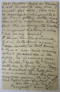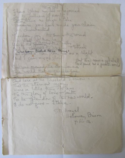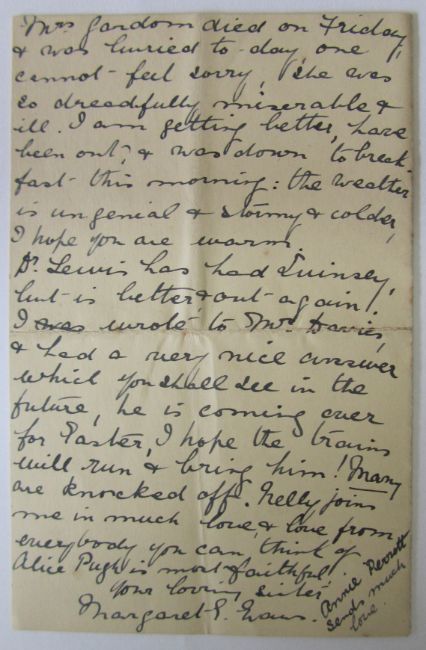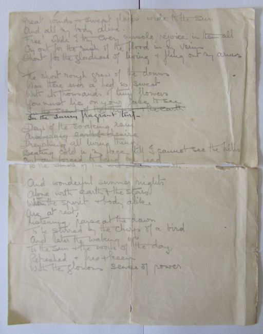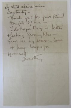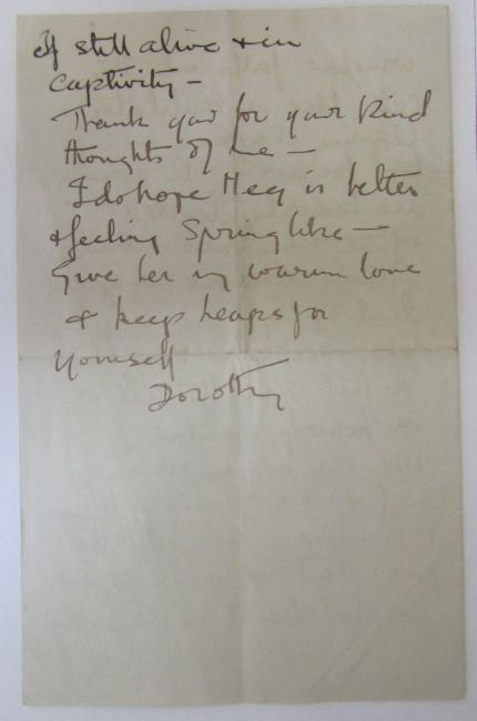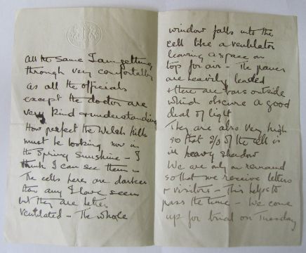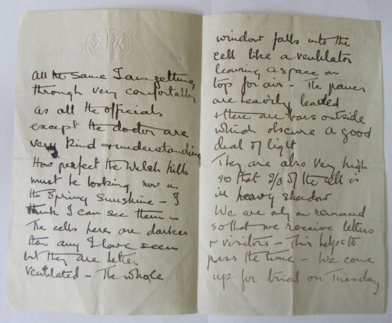 v) A letter from Dorothy fellow inmate in prison to Kate after she has left prison it reads 'Your flowers have been such a joy to me through a very strenuous time. Now I am getting some mental and spiritual peace, though my body is suffering - I find I am getting ill much sooner now I am not taking water either...The cells here are darker than any I have seen...We come up for trial on Tuesday if still alive and in captivity...'