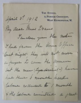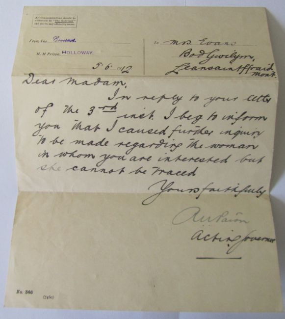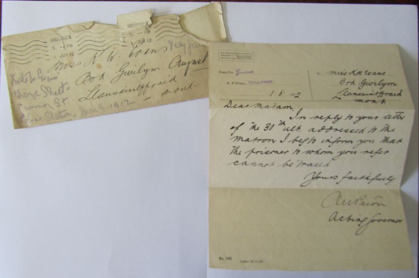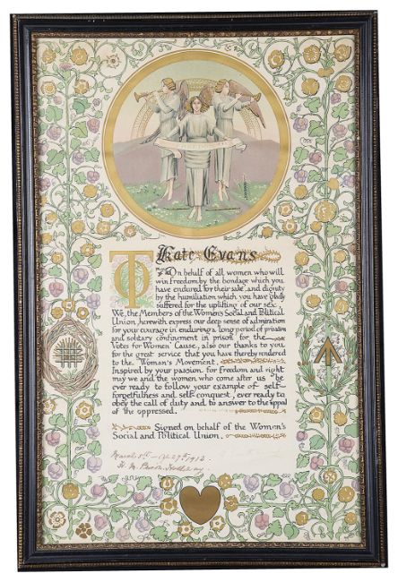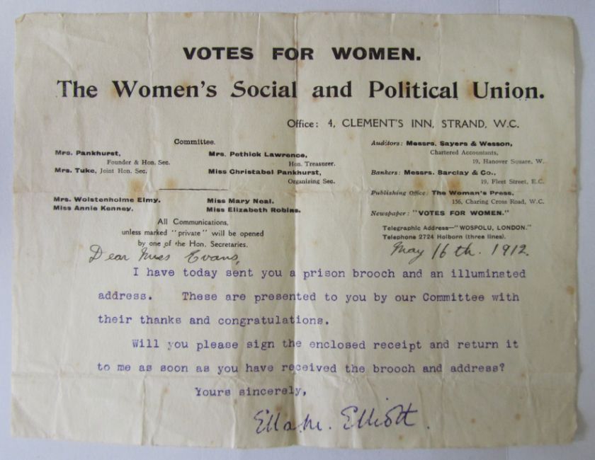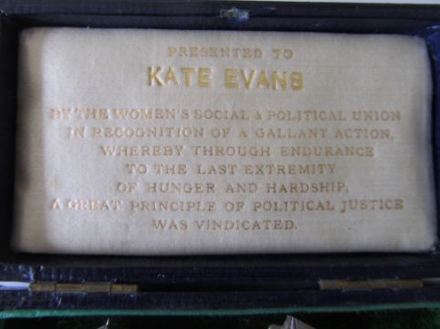 Kate Williams Evans was born in 1866 in Llansantffraid, Mongomeryshire. Growing up she was interested in Politics and spent a considerable time in Paris. Whilst there she met with people interested in the Women's Social and Political Union. In her early thirties she joined the Union and was an active member. She became a Suffragette to the dismay of her parents who thought the behaviour of these women was quite shocking. On 4th March 1912 she was arrested, imprisoned and served 54 says in Holloway prison. This collection is to be offered for auction by the family.