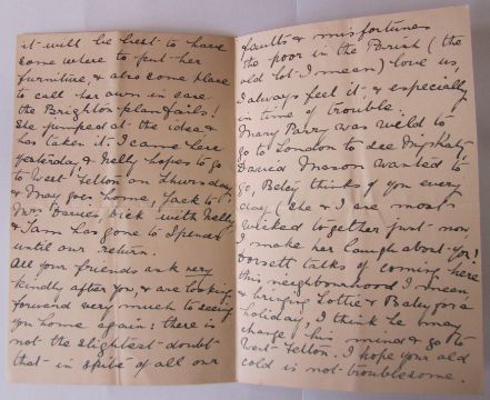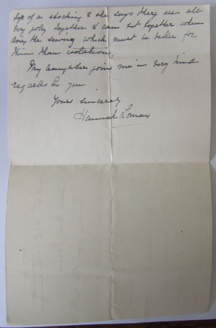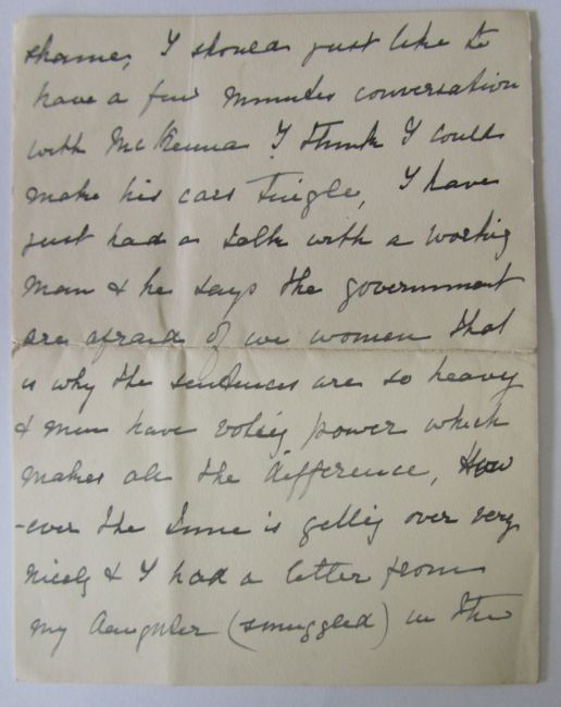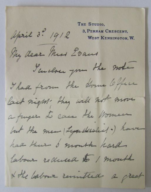 iv) A hand written letter from fellow inmate and suffragette Sarah Benett to her maid Jane regarding the health of Kate Evans as the hunger strike began (Kate explained that she had this letter stitched to the hem of her skirt) the letter reads' Miss Evans will be my guest till she is a little stronger. She has been starving so treat her as an invalid...'
