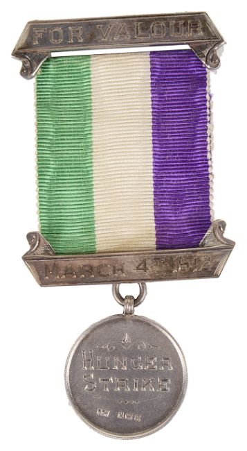the medal engraved Hunger Strike to the obverse and Kate Evans to the reverse, complete with three coloured purple (dignity), green (hope) and white (purity) ribbon and two silver bars one engraved March 4th 1912, contained within original velvet lined presentation box with printed inscription to the silk lined lid, together with an accompanying letter from The Women's Social and Political Union stating that Miss Evans has been presented with a prison brooch: