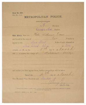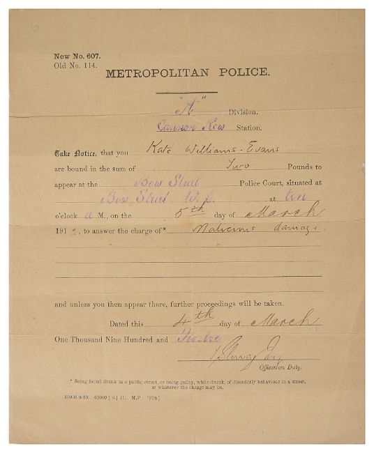 i) Metropolitan Police arrest warrant issued to Kate on 4th March 1912 for 'Malicious damage'
