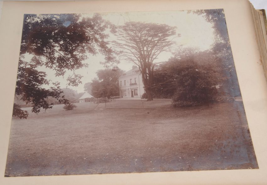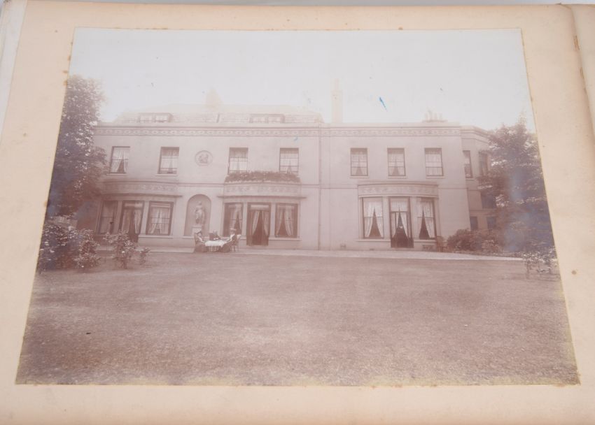 the parchment bound album with "The Old Home" in gilt lettering on the front cover, opening to reveal nineteen photographs relating to the Shipbuilders - the Yarrow family in their house "Woodlands" in Blackheath, London.