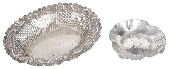a quatrefoil ashtray, with hammered effect, hallmarked Dublin 1971 by Royal Irish Silver Co and an Victorian oval pierced foliate embossed bon bon dish, hallmarked Sheffield 1900 by Fenton Brothers, (2).