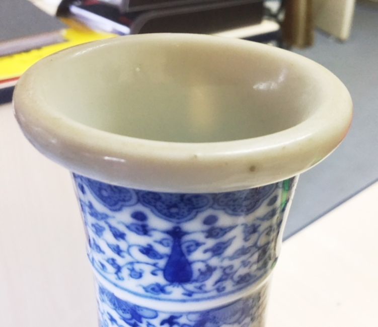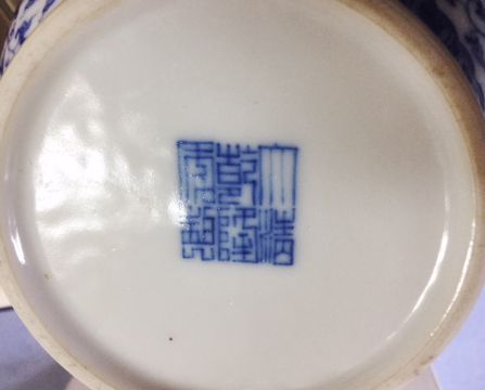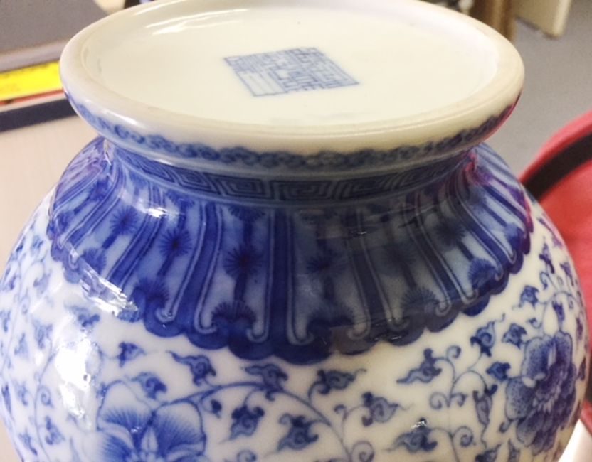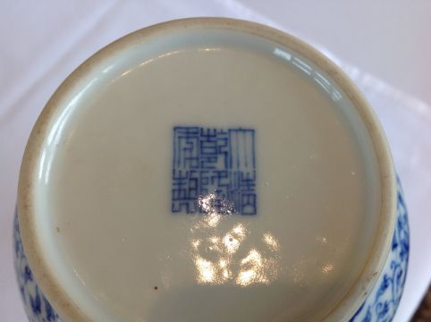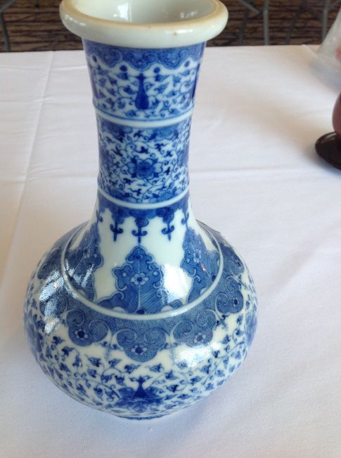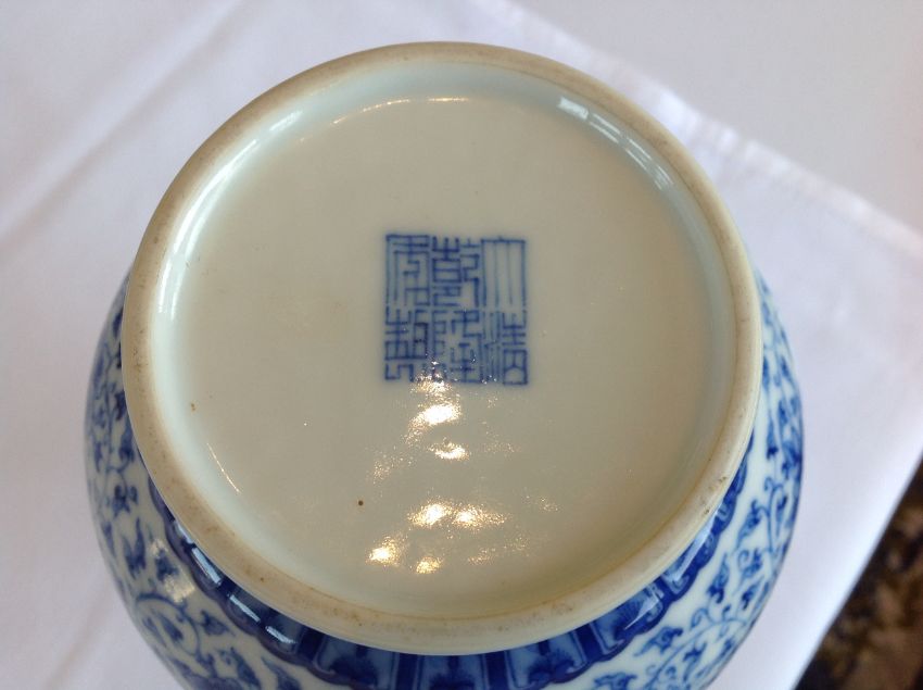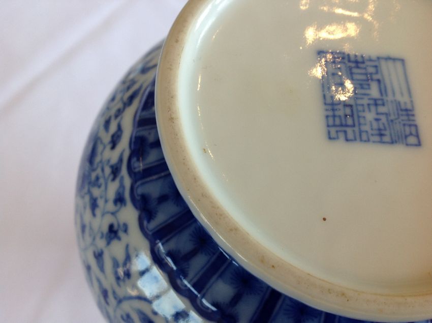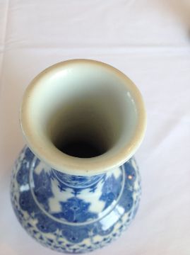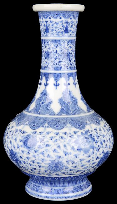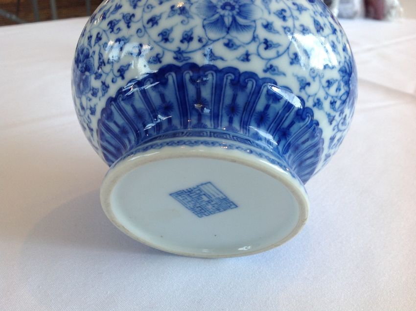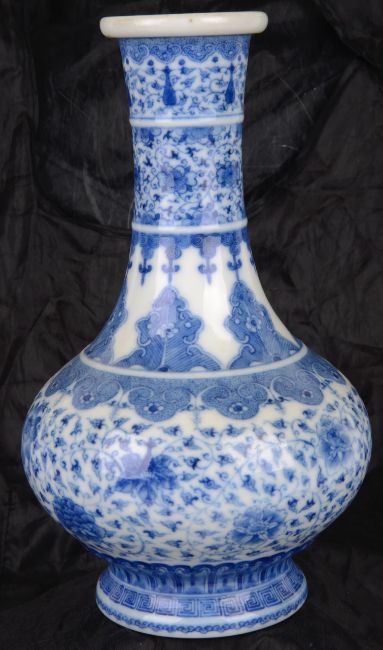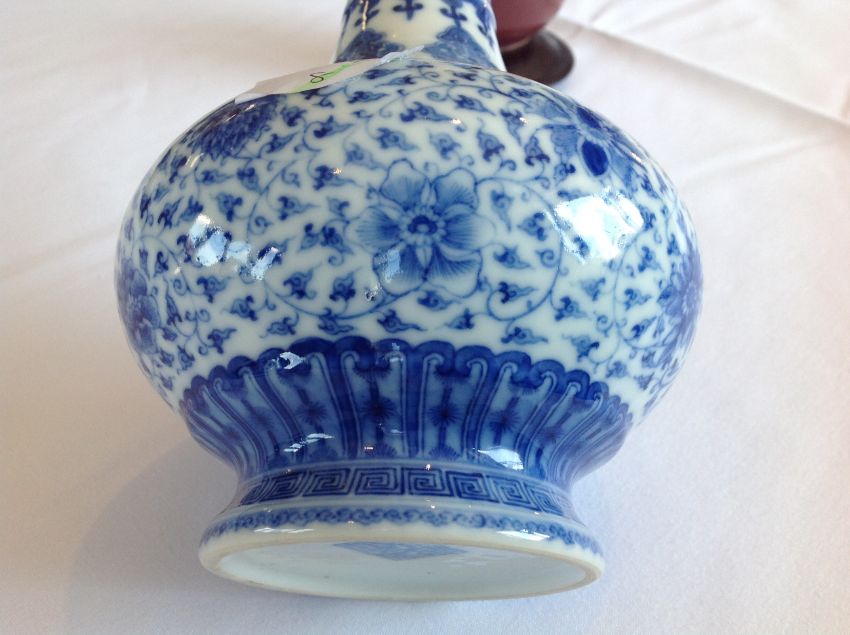 A Chinese 20th century blue & white bottle vase the body well painted with scrolling blooms below stylised bands of leaves, apocryphal Qianlong seal mark to base Condition:Overall good, no chips, scratching or rubbing, no visible damage or restoration
