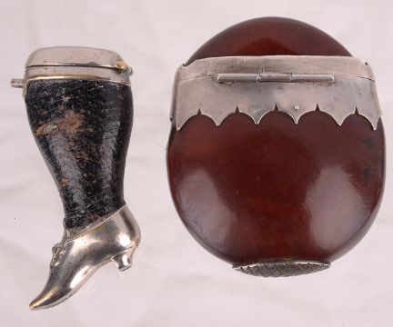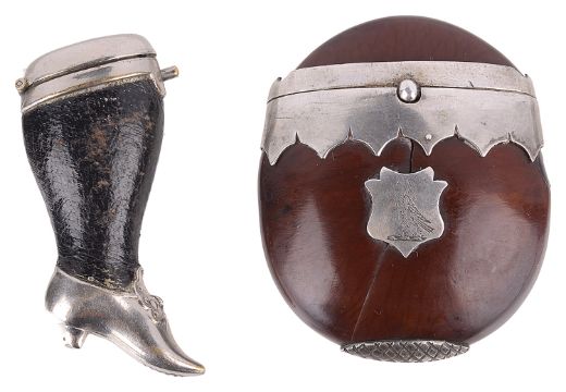 comprising an Australian Burra bean vesta case and another modelled as a lady's lower leg with plated shoe and hinged lid (2).