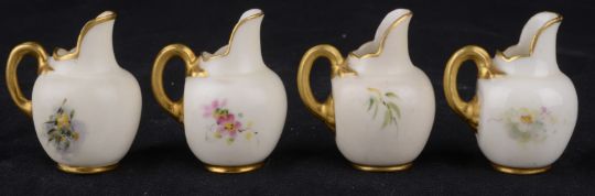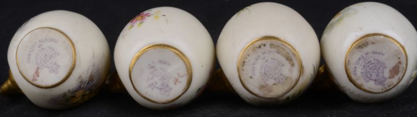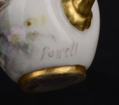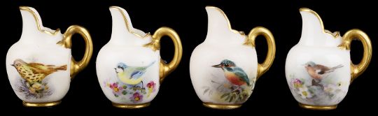 each decorated with ornithological subjects, the reverse with flower sprays, detailed with gilt handle, two of them signed W. Powell, each one with puce printed marks to base, (4).