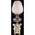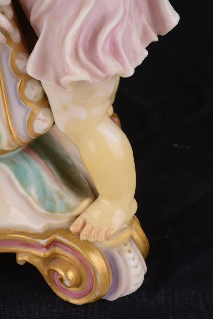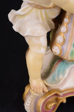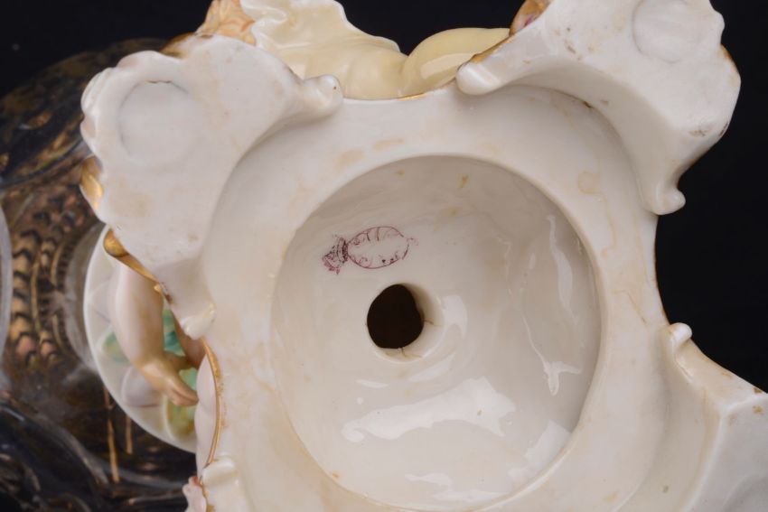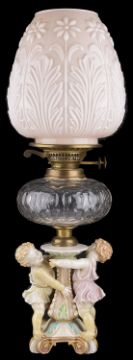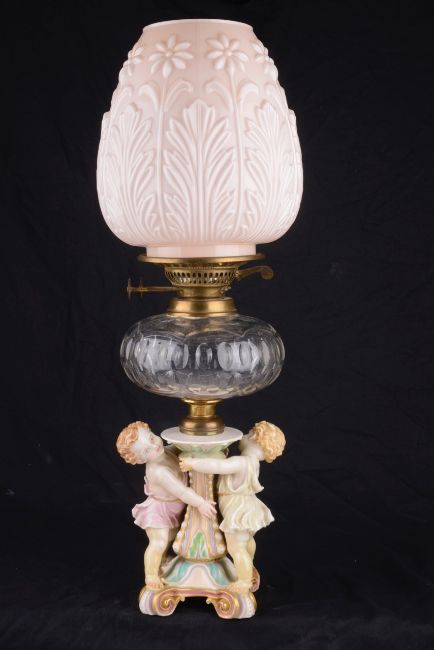 Condition: Professional restoration to both legs and feet of each child which has been discoloured with age. Child in white clothing in addition has extensive discolouration to right arm, chest and left hand. Child in pink clothing has discolouration restoration to the left hand. The glass resevoir is in good order overall with some plaster repair to the rim where the mounts are. The oil lamp mechanism needs some attention. The shade is probably later with some minor fretting to the rim. First hand inspection suggested.