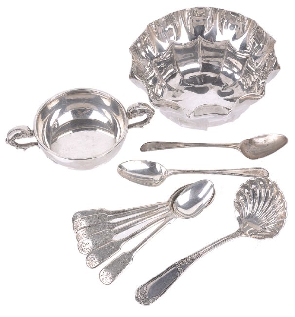 with pinched edge and facetted base by James Dixon & Sons Ltd, together with a George V twin handled silver quaich hallmarked Sheffield 1936 by E J Gallichan & Co Ltd, six Edwardian silver teaspoons hallmarked Sheffield 1908 by John Roberts, two silver teaspoons, hallmarks rubbed and a silverplated sifter spoons, (11).