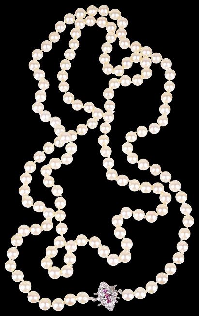 An opera length string of cultured pearls with ruby and diamond clasp