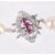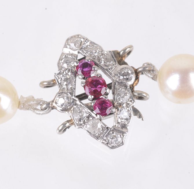 the pearls even sized and with pinkish hue and having diamond shaped push clasp fastening set with three central rubies within a diamond shaped and set clasp, tests for gold