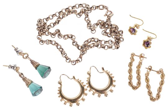 together with an amusing pair of carved green glass intaglio drop earrings, one carved with a hound, the other with the word 'Saturday' test for gold and also with three other pairs of 9ct gold earrings (5)