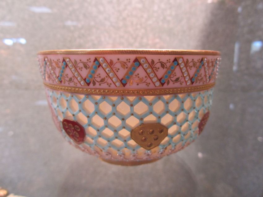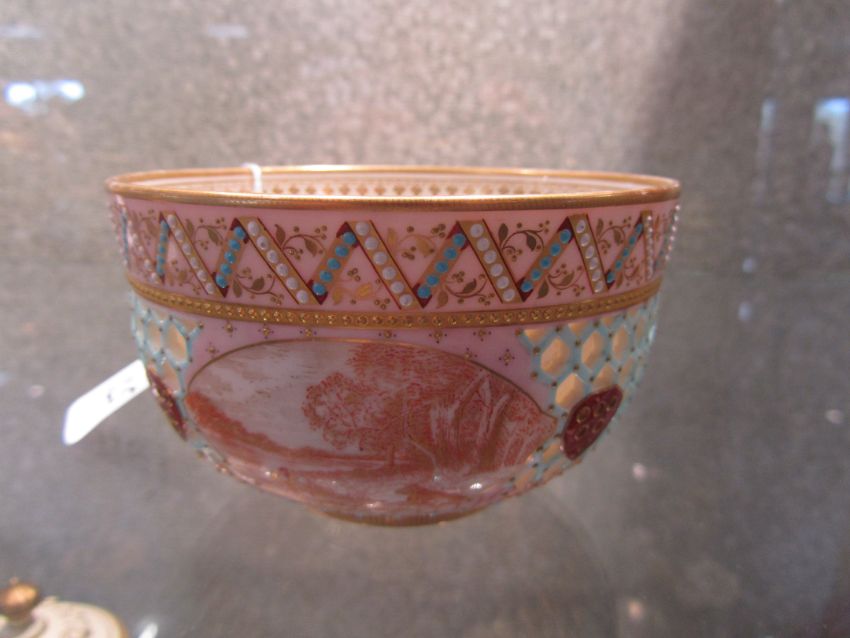 the central reticulated band with vignettes of gilt painted rural scenes, red and gilt coloured shields, flanked by bejewelled borders, with green printed marks to base