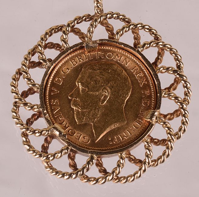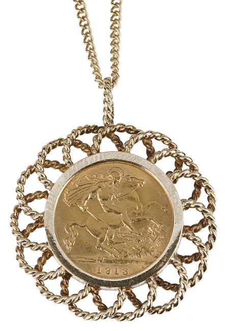 A George V 1918 gold half sovereign in 9ct gold mount with 9ct gold chain