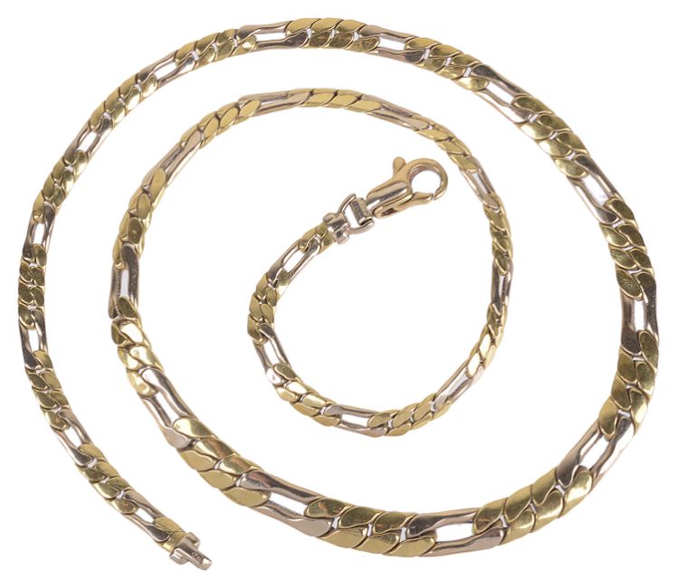 An 18ct flat fancy link two coloured gold figaro necklace