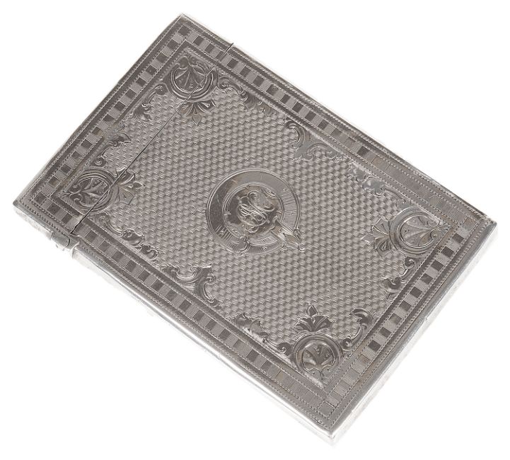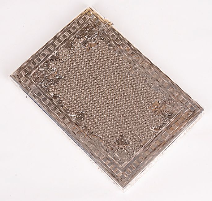 of rectangular form with acanthus and engine turned engraved body, the cartouche of the front with engraved initials, probably by Frederick Marson.