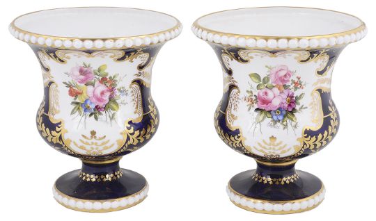 of campana shape painted to each side with a floral bouquet by C.Gresley, signed, within gilt framing, the rims with white moulded bead detail, red printed and painted factory marks to bases with incised numerals 1763 (2)