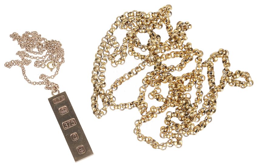 ingot weight approximately 19 grams, chain testing for gold, together with a heavy gilt metal belcher long guard chain (2)