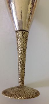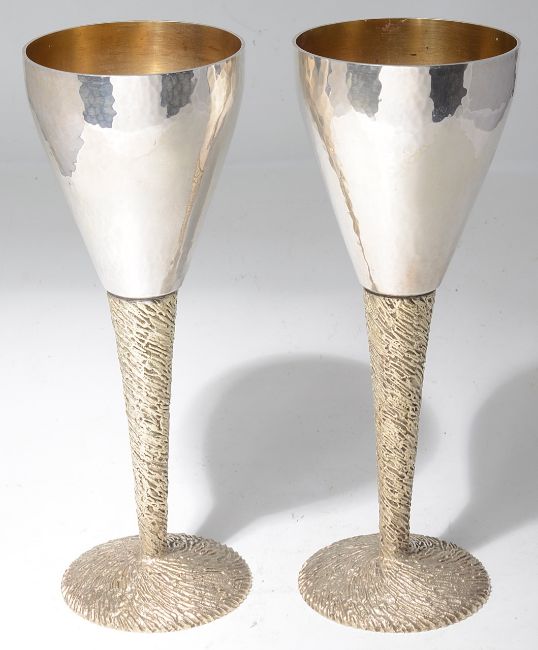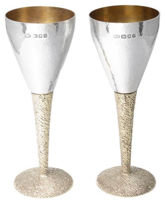 the planished trumpet bowls with silver-gilt interior, raised upon tapering stems and circular foot ring, with textured decoration, (2).