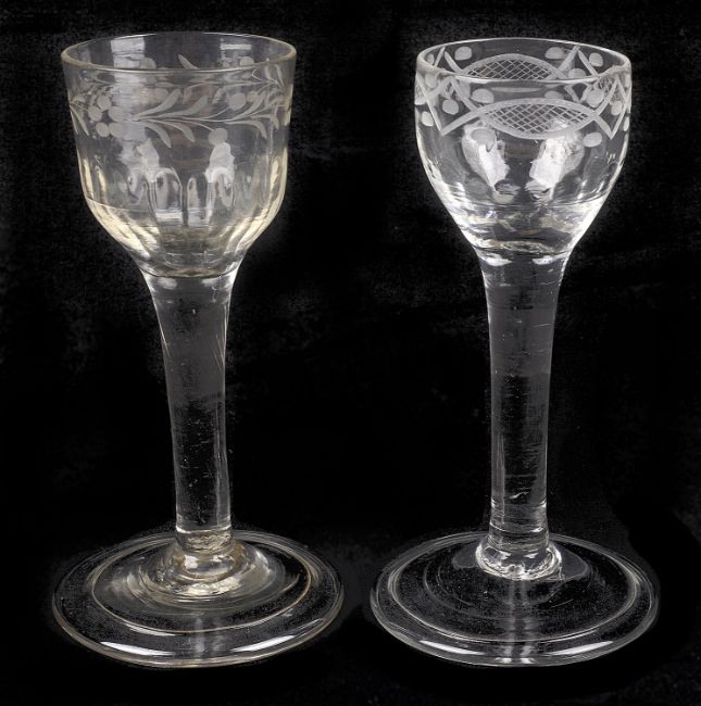 Two engraved plain stem wine glasses, mid 18th century