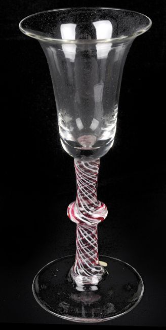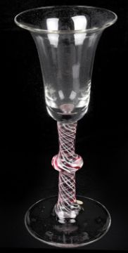 A colour twist wine glass, circa 1770 *** the bell bowl raised on a centrally knopped plain stem with four red spiral threads alternating with pairs of white spiral threads above the conical foot height approx 16.5cm Condition: Foot reduced otherwise in fair condition. *** It has come to our notice that this is possibly a 19th century example and not as catalogued. ***