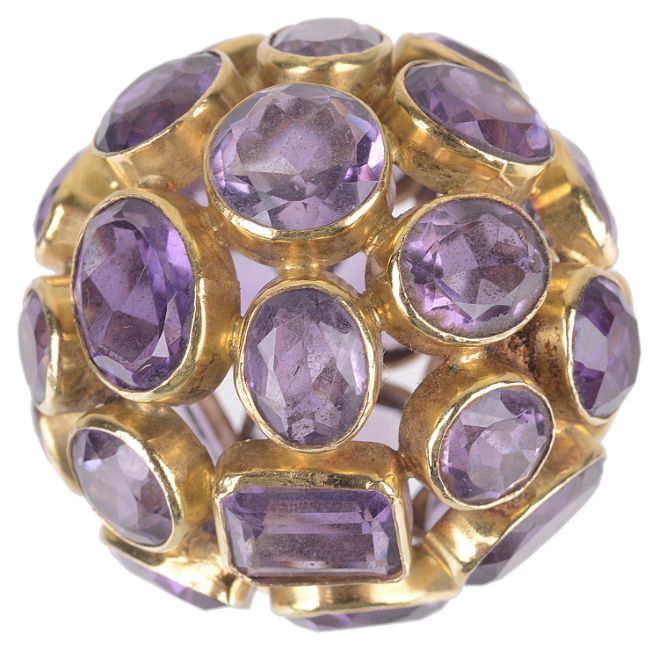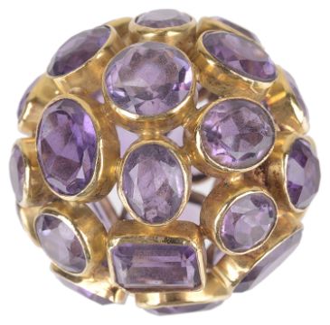 the 18ct pierced ball set overall with collet mounted amethysts of matched colour of different cuts and sizes