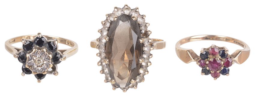 one set with rubies and sapphires, one with a small diamond and sapphires, together with another gem set cluster ring (3)