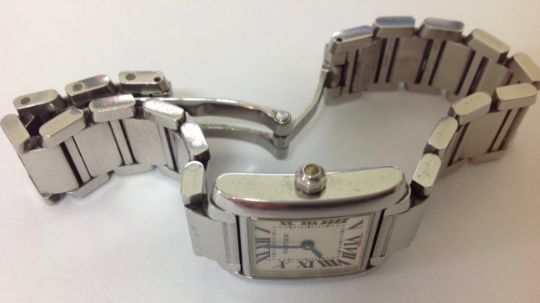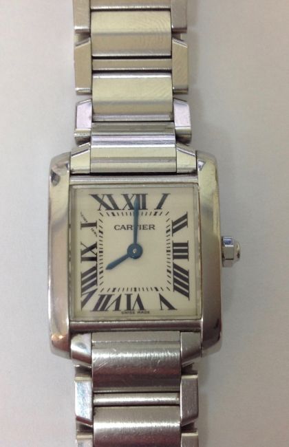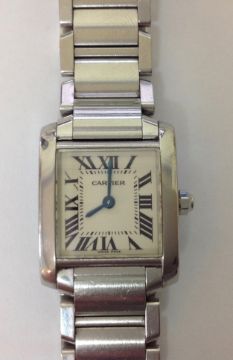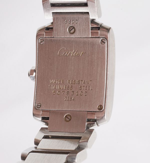 the square dial with Roman hours, dauphine hands, Cartier logo, quartz movement, with link bracelet and clasp, case back numbered: 507831CD 2384, with original Cartier red box and Cartier red folder with booklets.
