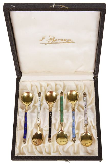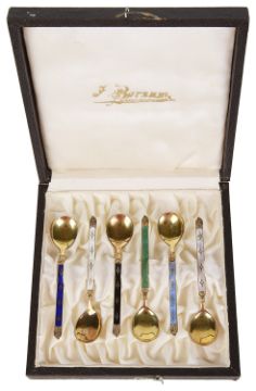 the silver gilt spoons with enamelled handles, hallmarked Sterling 925, in a fitted case.