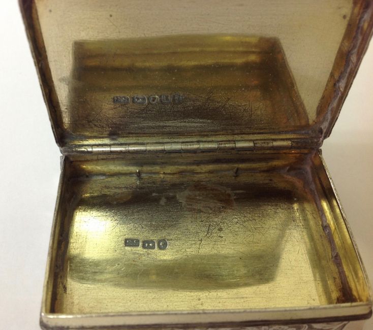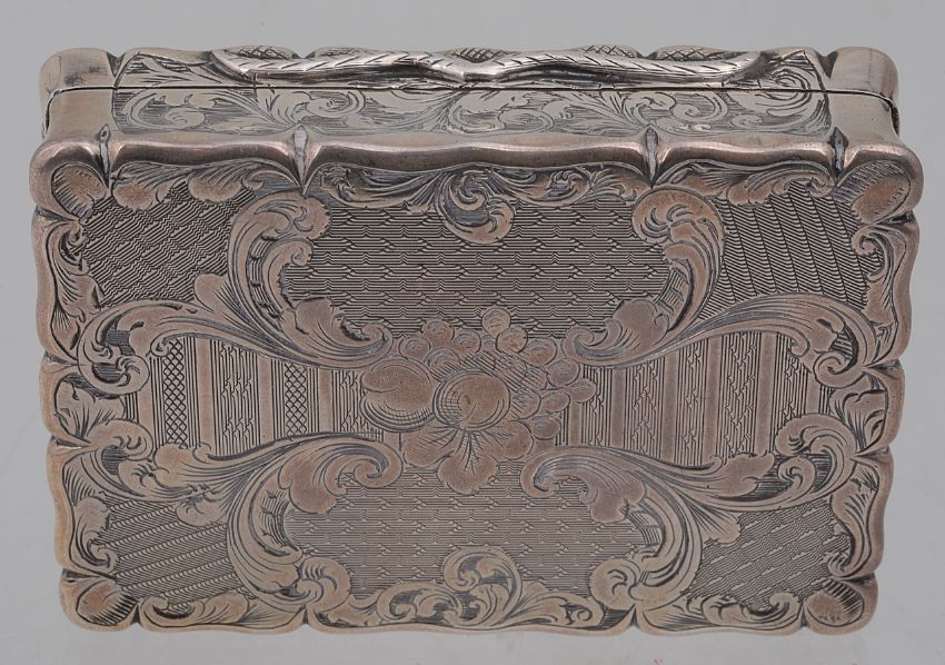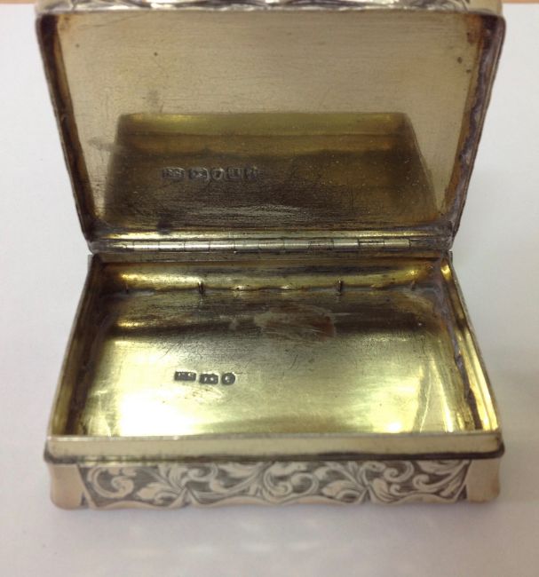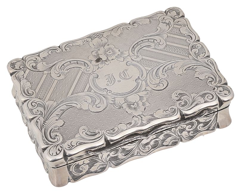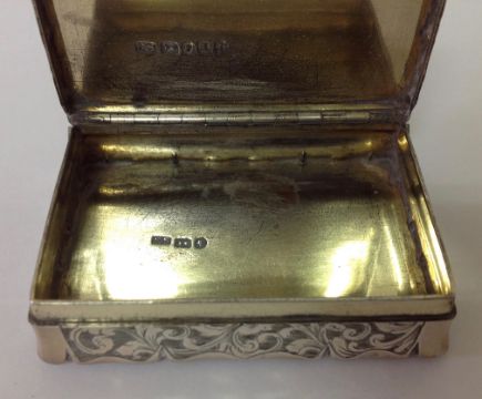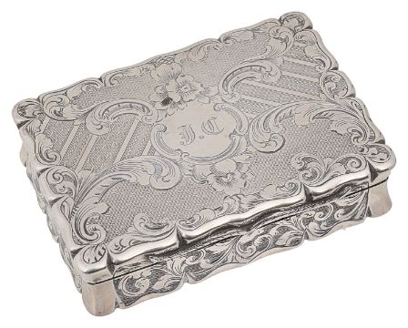 of rectangular form with hinged lid, the body decorated with acanthus scrolled leaves surrounding a cartouche engraved with initials, silver gilt interior, by Edward Smith.