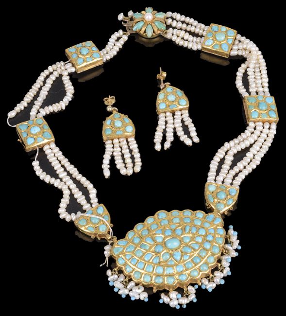 An Indian turquoise and freshwater pearl set necklace and earrings