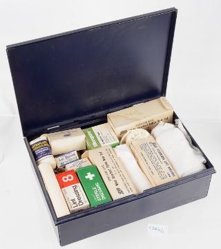 the hinged lid with applied gold lettering, complete with contents including sterile dressing, bandages surgical tape etc.