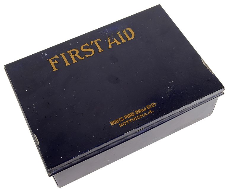 A vintage navy blue Boots 'First Aid' tin
