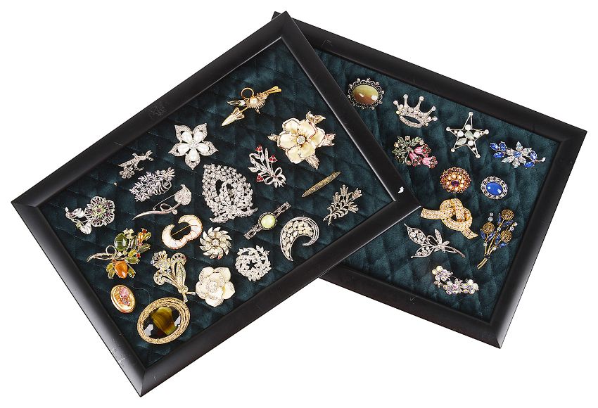 including a vintage Komai work pin, several marcasite brooches, aurora borealis rhinestone crown and more, several signed, together with a pair of modern quilted display frames (qty)