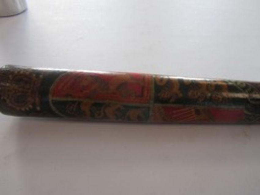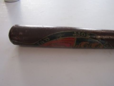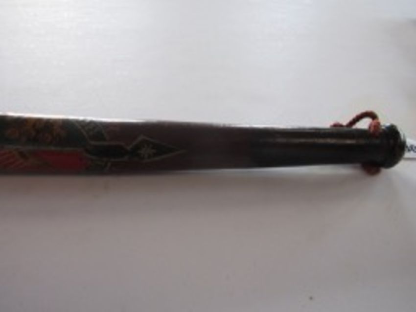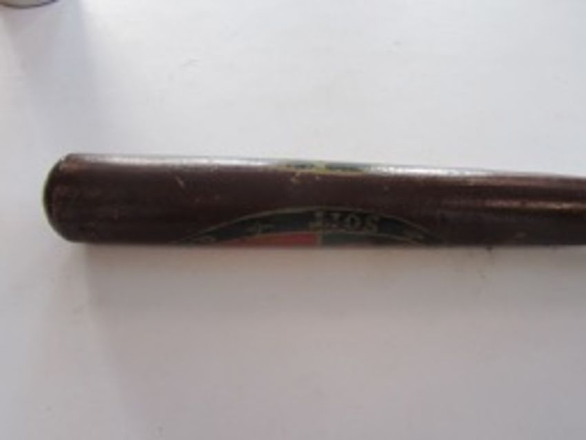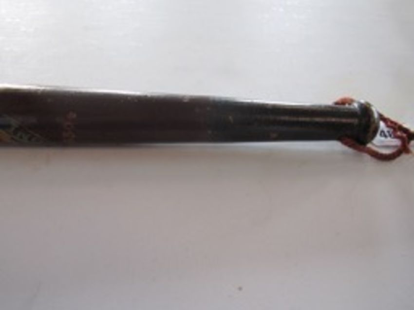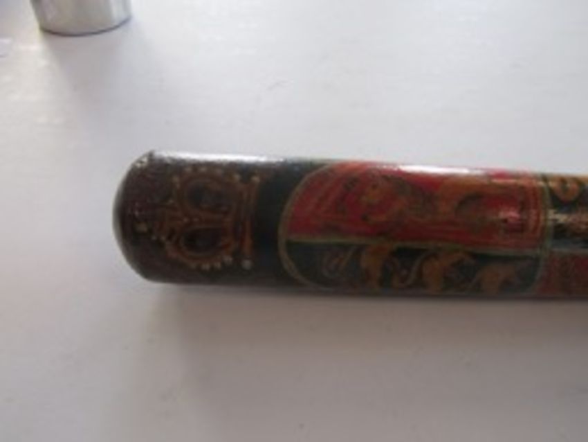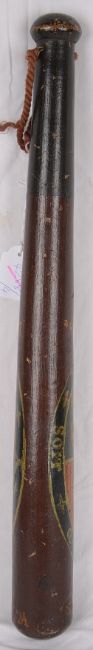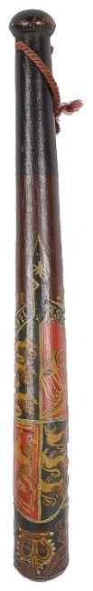 A William IV wooden truncheon, dated 1830 of tapering form polychrome painted with the order of the garter coat of arms. length: 47.5cm approximately. Condition: Fair to good, with wear throughout, surface scratches, paint losses, dent at top end, dent in centre left side of crest