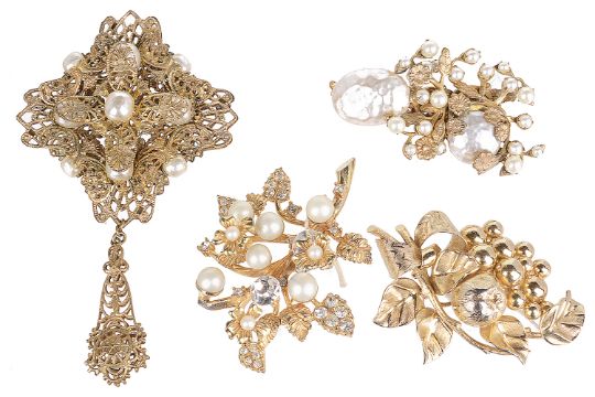 comprising large Miriam Haskel filigree pendant faux pearl brooch and a large faux pearl floral spray brooch, both with signature tab to reverse, together with a Hattie Carnegie 'en tremblant' floral spray brooch, signed to reverse and stylised relief 'apple bough' brooch by Grosse (4)