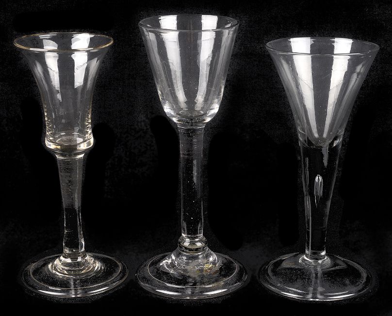 the rounded funnel bowl above a solid stem with small basal knop on the folded conical foot, together with another plain stem wine glass with bell bowl on a folded conical foot and a tiered stem wine glass on a folded conical foot (3)
