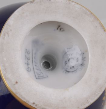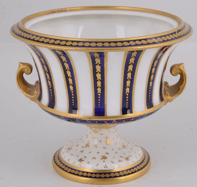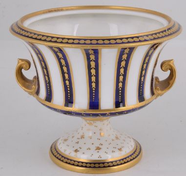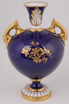 the tapered ovoid body painted by Chair, signed, with an arrangement of roses within gilt scroll framing against a cobalt blue ground, flanked by gilt handles, the neck with leaf moulded detail, blue printed factory marks to base with shape number '2249', together with a Royal Crown Derby two handled striped vase, circa 1900, painted with a landscape view of a river, (2)