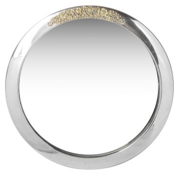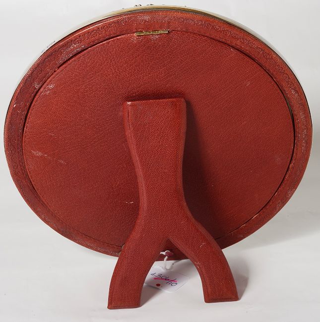 of circular form with applied silver-gilt flowerhead mount and red leather easel back.