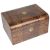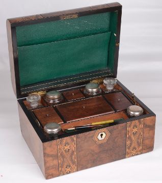 the exterior with geometric marquetry inlay bands, the hinged lid opening to reveal a fitted interior, with pull out tray and glass bottles, concealed side drawer, together with a Victorian burr walnut brass bound jewellery box, the pierced strap exterior banding with hinged lid opening to reveal fitted interior and a mid 20th century rectangular form jewellery box, with painted silhouette to the hinged lid, raised upon ball supports, (3).