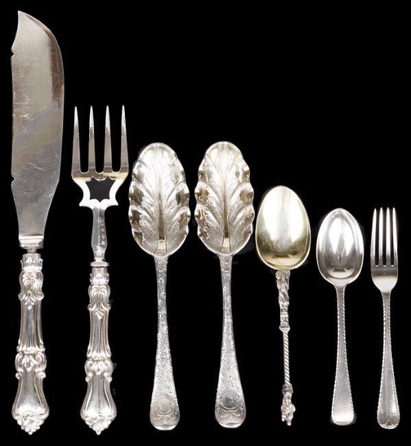 Condition: Fair to good, with wear to each, the hallmarks are rubbed on the Georgian spoons, and serving knife and fork, the serving knife and fork are not included in the weight.