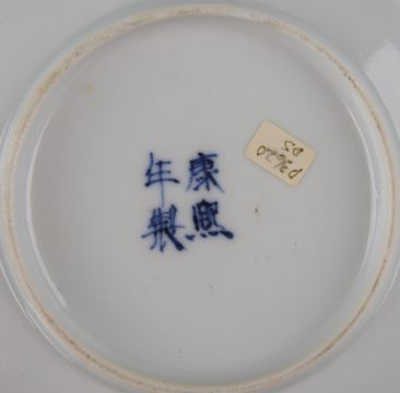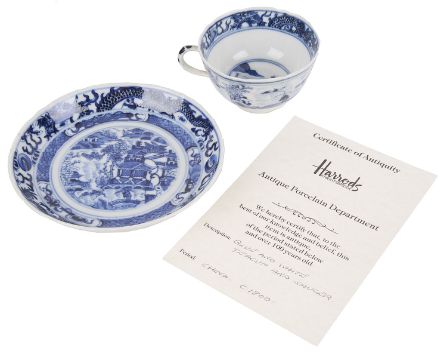 A Chinese blue and white export porcelain teacup and saucer, mark of Kangxi but late 18th/early 19th century,