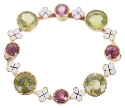 A delicate Edwardian peridot and pink gem circle posy brooch