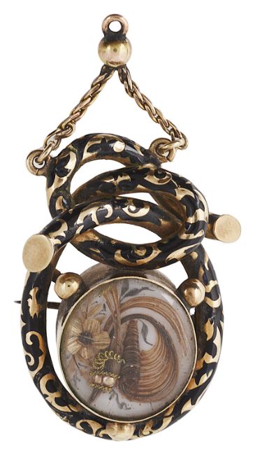having central oval fine hair decorated locket within a yellow metal scroll twist mount, with black scroll enamel detail tests for gold, could be worn as a pendant