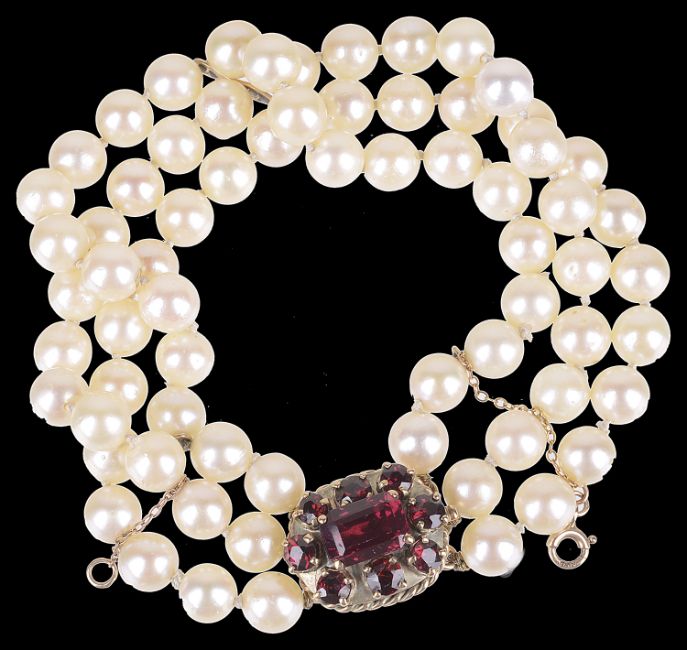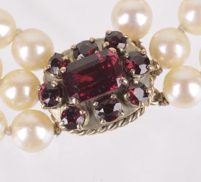 A three row cultured pearl bracelet with garnet set clasp