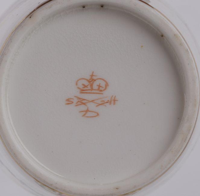 Condition: Fair to good, with wear to the painted areas, crack in the saucer and cup.