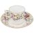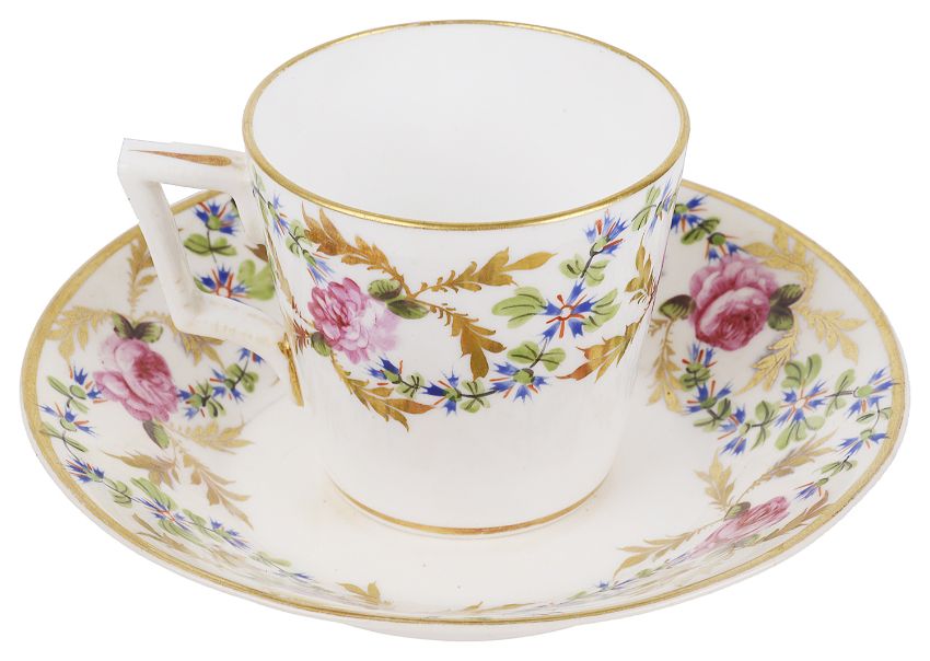 the tapered cup painted with colourful rose and leaf garland, with similarly decorated saucer, with painted mark to base