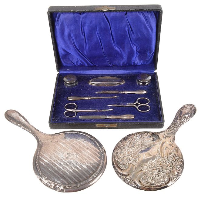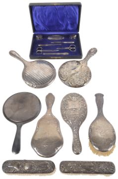 the cased George V silver manicure set with silver handled instruments in a fitted case, hallmarked Birmingham 1920/21 by R U & Co Ltd; together with five silver dressing table mirrors, decorated with embossed foliate or engine turned decoration and three silver dressing table brushes, (qty)