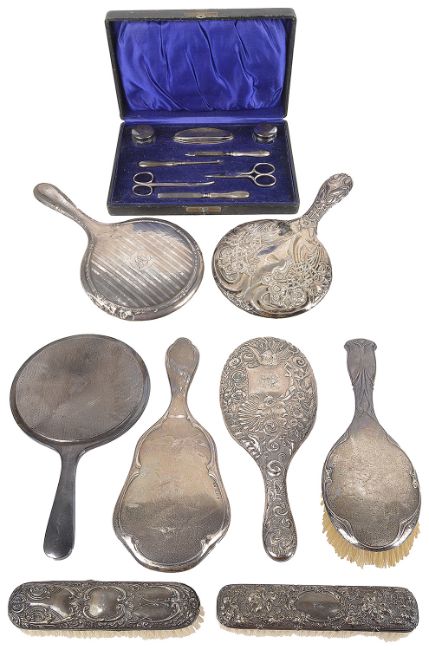 Condition: Fair to good, with wear to each, surface scratches and dents with some splits and repairs apparent to some of the mirrors, some chips to the mirror glass, some of the hallmarks are rubbed, NOT tested for silver.