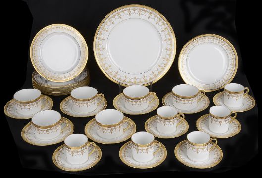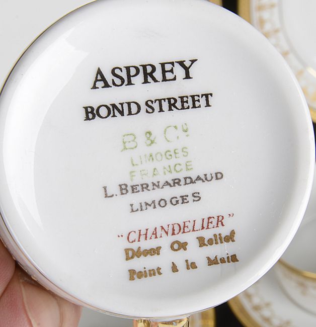 An Asprey Bernardaud Limoges porcelain part service, mid 20th century, decorated in the 'Chandelier' pattern with gilded garlands suspended from stylised fleur-de-lys and solid gilt rims, comprising six coffee cans and saucers, six teacups and saucers, six tea plates and a cake plate, various printed marks to bases with 'Asprey Bond Street' stamp